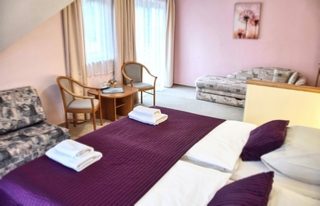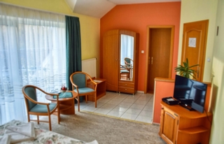 Tágas, nagy alapterületű szoba, mely igény esetén 3 illetve 4 fő részére pótágyazható. A klimatizált szobához, zuhanykabinos fürdőszoba és erkély tartozik. A szobák igény esetén különágyas vagy francia ágyas elhelyezéssel is igénybe vehetőek.